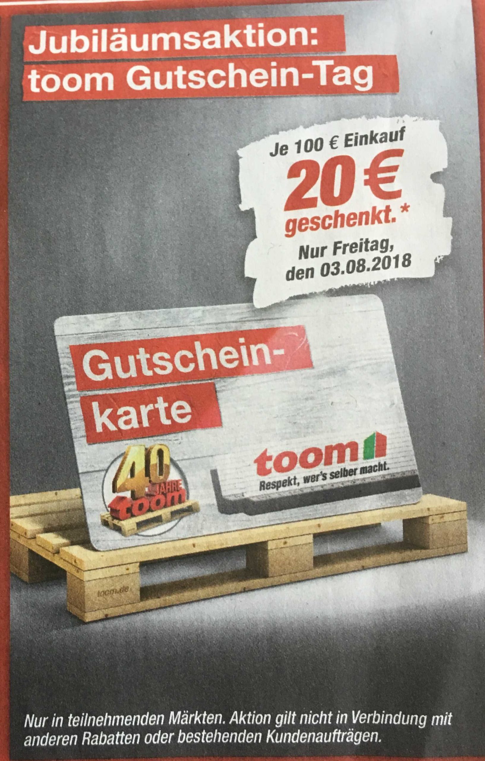 Am nächsten Freitag und nur am Freitag (03.08.2018) gibt es bei toom wieder je 100€ Einkauf einen 20€-toom-Gutschein dazu. Wenn man also gerade sowieso einen Einkauf plant, kann man die 20€ gut mitnehmen.