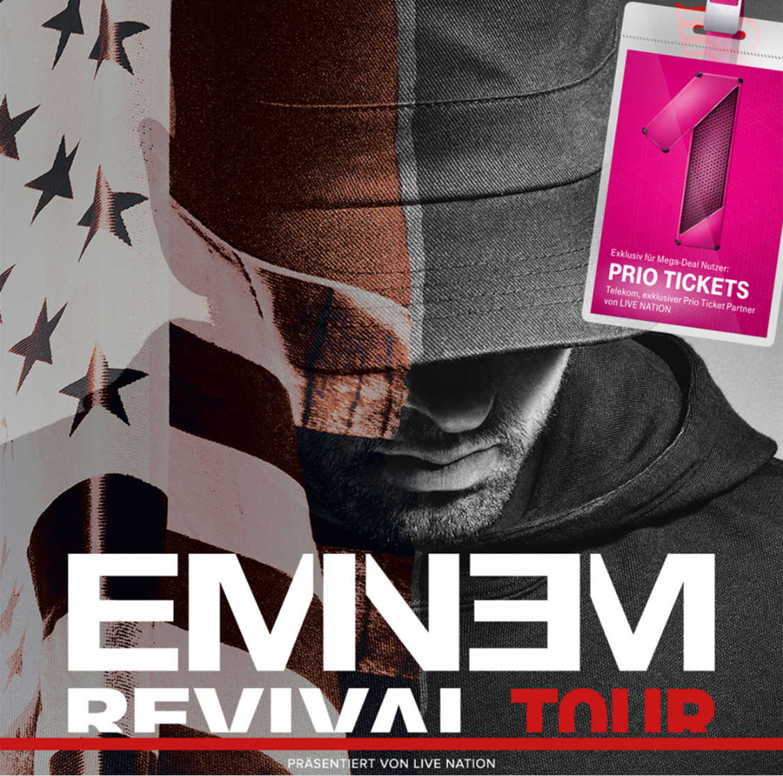 EMINEM TICKETS EXKLUSIV VOR ALLEN ANDEREN Das Warten hat ein Ende. Nach Veröffentlichung seines neuen Albums „Revival“ im Dezember 2017 und der Ankündigung einiger ausgewählter Auftritte in den USA kommt die Rap-Legende Eminem endlich wieder nach Deutschland. Die exklusive Deutschland Show des Oscar- und Grammy-Preisträgers findet am 10. Juli 2018 in Hannover statt. 48 Stunden vor dem offiziellen Vorverkaufsstart können sich nicht nur alle MagentaEINS Kunden, sondern jetzt auch einmalig alle Telekom Kunden im Rahmen dieses Mega Deals Tickets sichern und live dabei sein.*