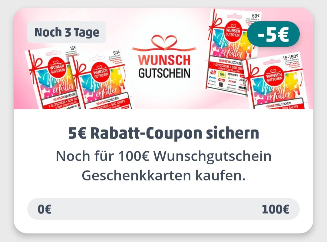 Wunschgutscheine für 100€ kaufen – 5€ Rabatt-Coupon erhalten Penny App