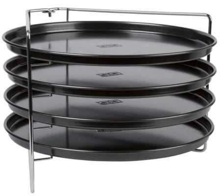 Das Set besteht aus 4 Pizzablechen mit Antihaftbeschichtung und eben, darauf kommt es an, einem Gestell mit dem sich 4 Pizzas gleichzeitig zubereiten lassen.